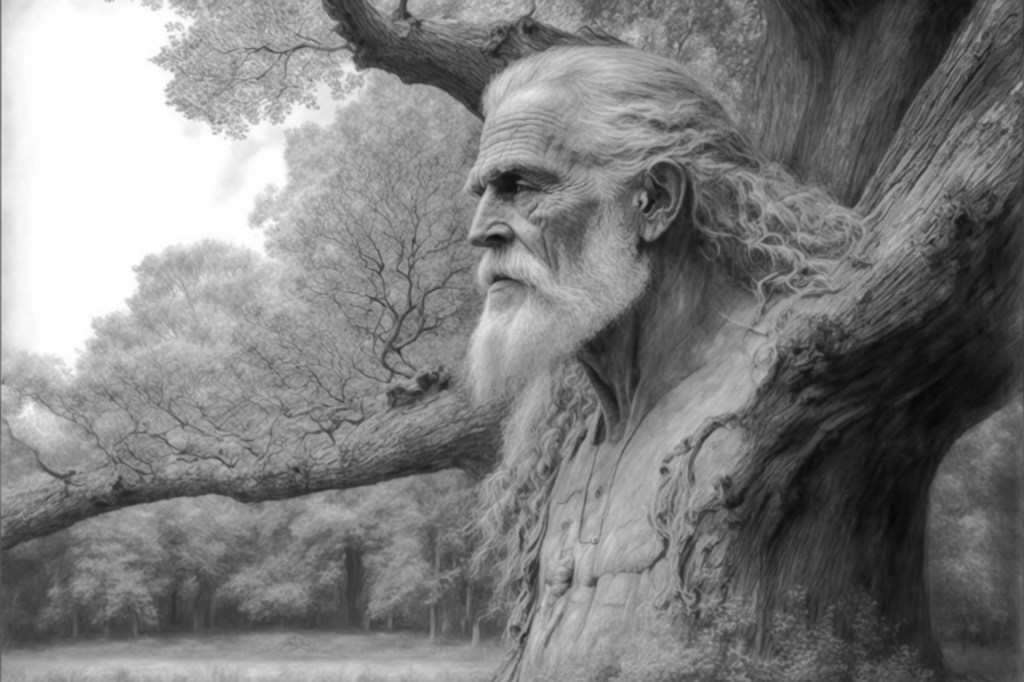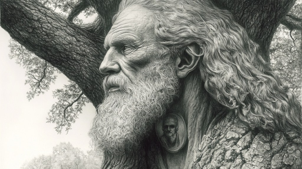 double exposure of the Major Oak tree and da Vinci’s profile