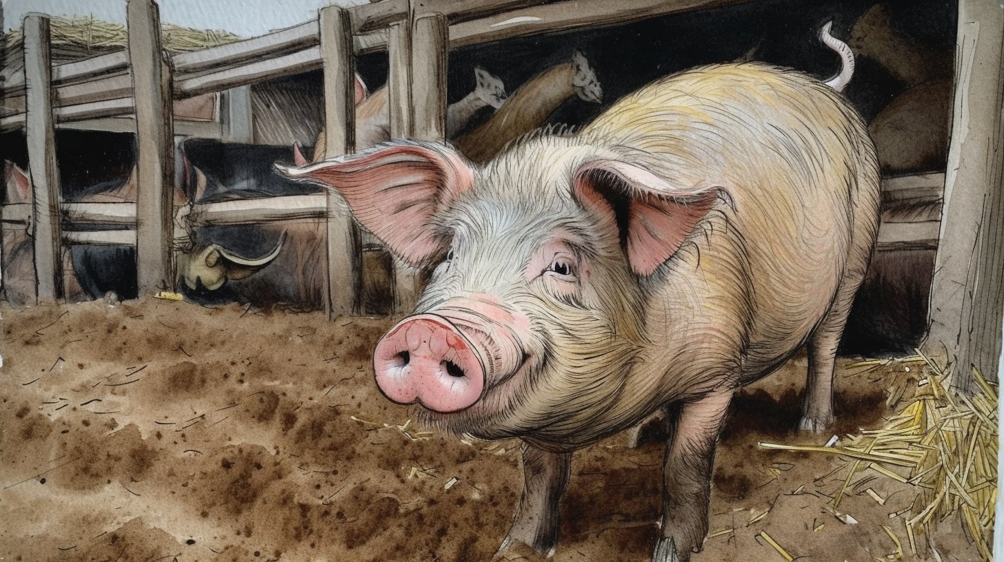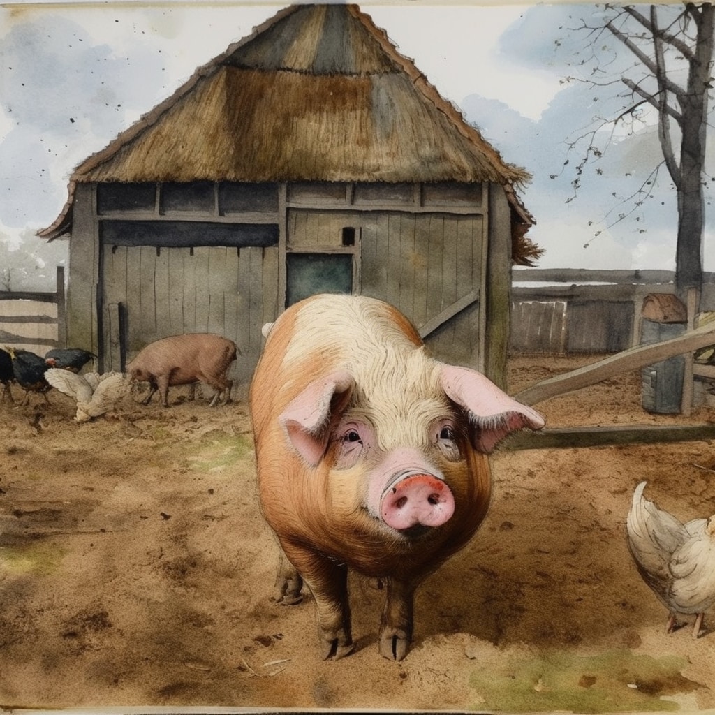 Cecilia ( @ceciliagunther ) and I have slipped in and out of each other’s blogs since November 2011. I have great admiration for her give-it-a-go attitude, her self-sufficiency and aim toward a sustainable lifestyle on her organic farm. She expressed an interest in A.I. digital artwork recently, and I’ve created this gallery of A.I. images from two photos posted on her blog at The Kitchens Garden. Her photos include a rooster and a 450-pound hog named FreeBee (he was the runt, and Cecilia got him free).