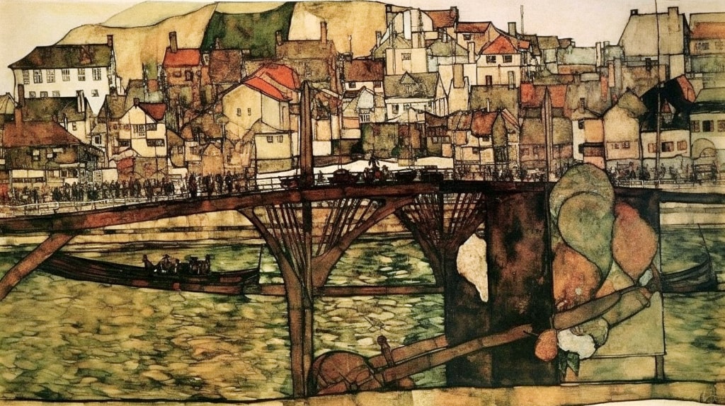 AI artwork: primitive style line drawing and wet watercolour of European city.