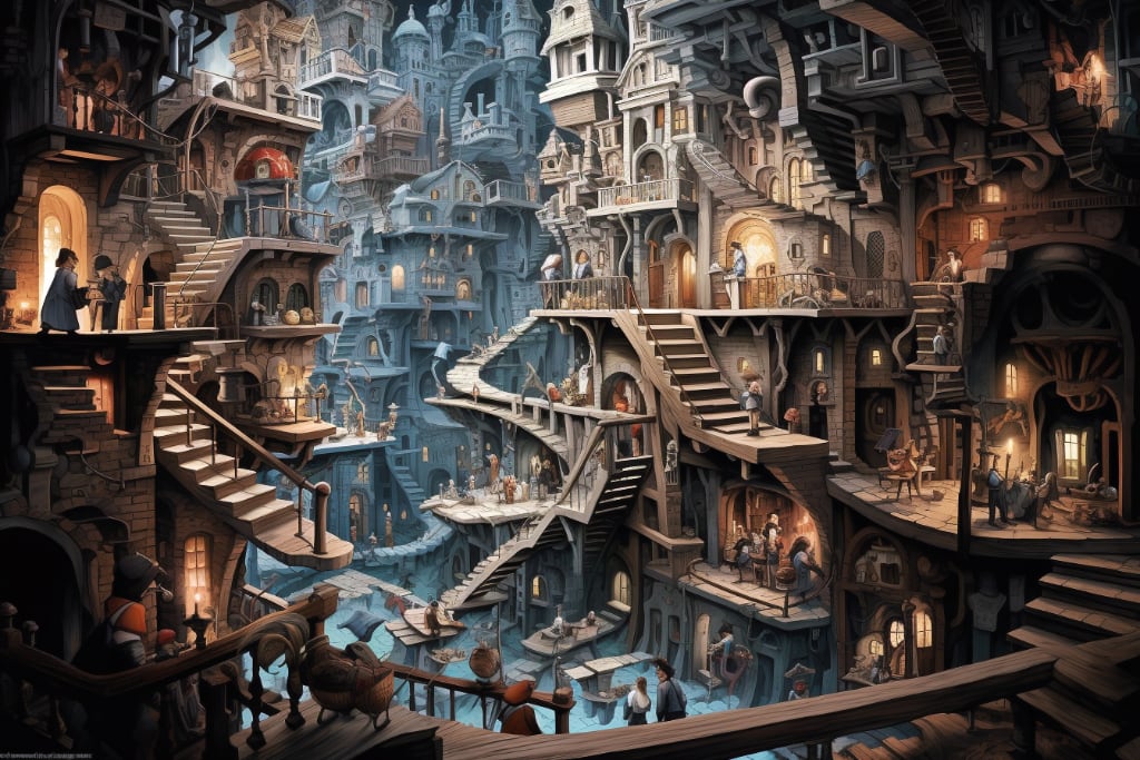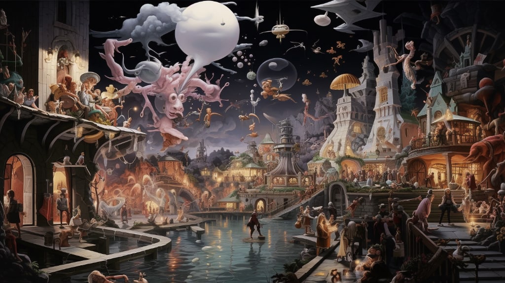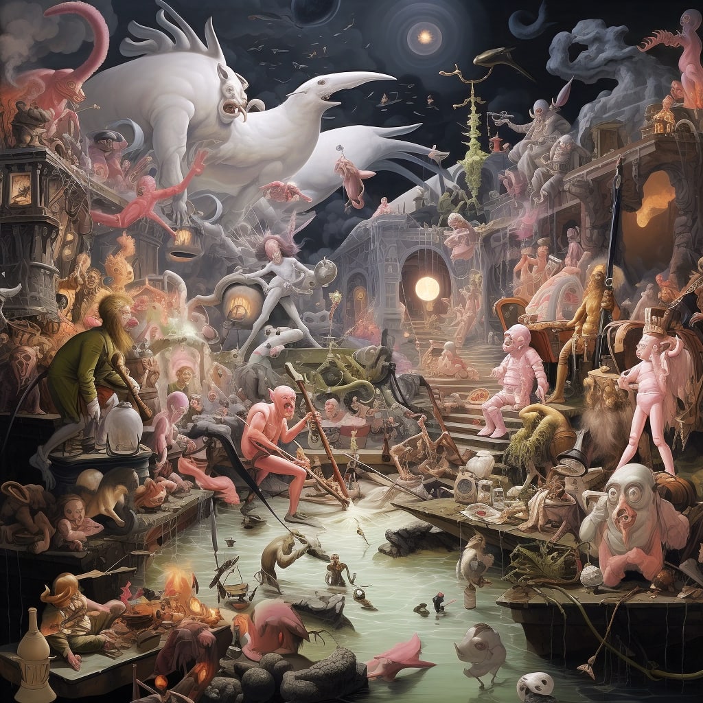 That word, barglefloop, means to mess with words in your AI prompt in order to confuse it, to turn nouns into verbs, to make single words compound, etc. In this instance, I only gave Midjourney the word barglefloop with an area ratio of 1:1 and 16:9. This is what AI generated; some looking very Hieronymus Bosch-like. Each image is clickable for viewing detail.
