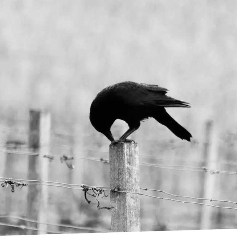 My crow. Well, he’s not really mine — I think it’s the other way around actually. It has random patches of white feathers: so he’s a “pied crow” — folklore says they represent duality, light and dark, often protectors.