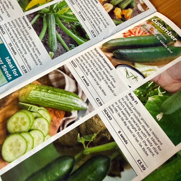8. Things that shout It’s Spring, like the Sutton’s seed catalogue arriving in the post. Let’s see — I saved seeds from last season’s tomatoes, so we don’t need those. English cucumbers! Yes. I want trugs full of them. Trug? What is a trug, you ask? Read here all about them.
