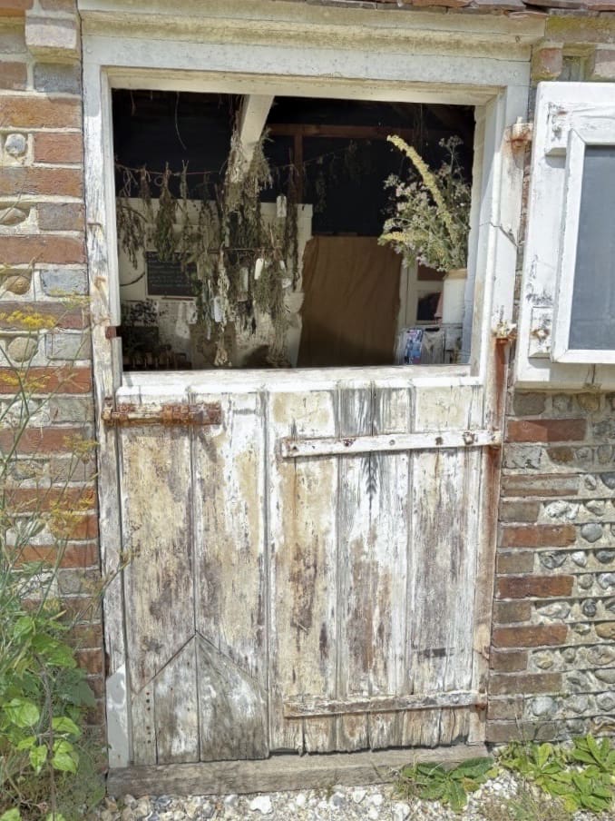 a well-weathered barn door with herbs drying inside